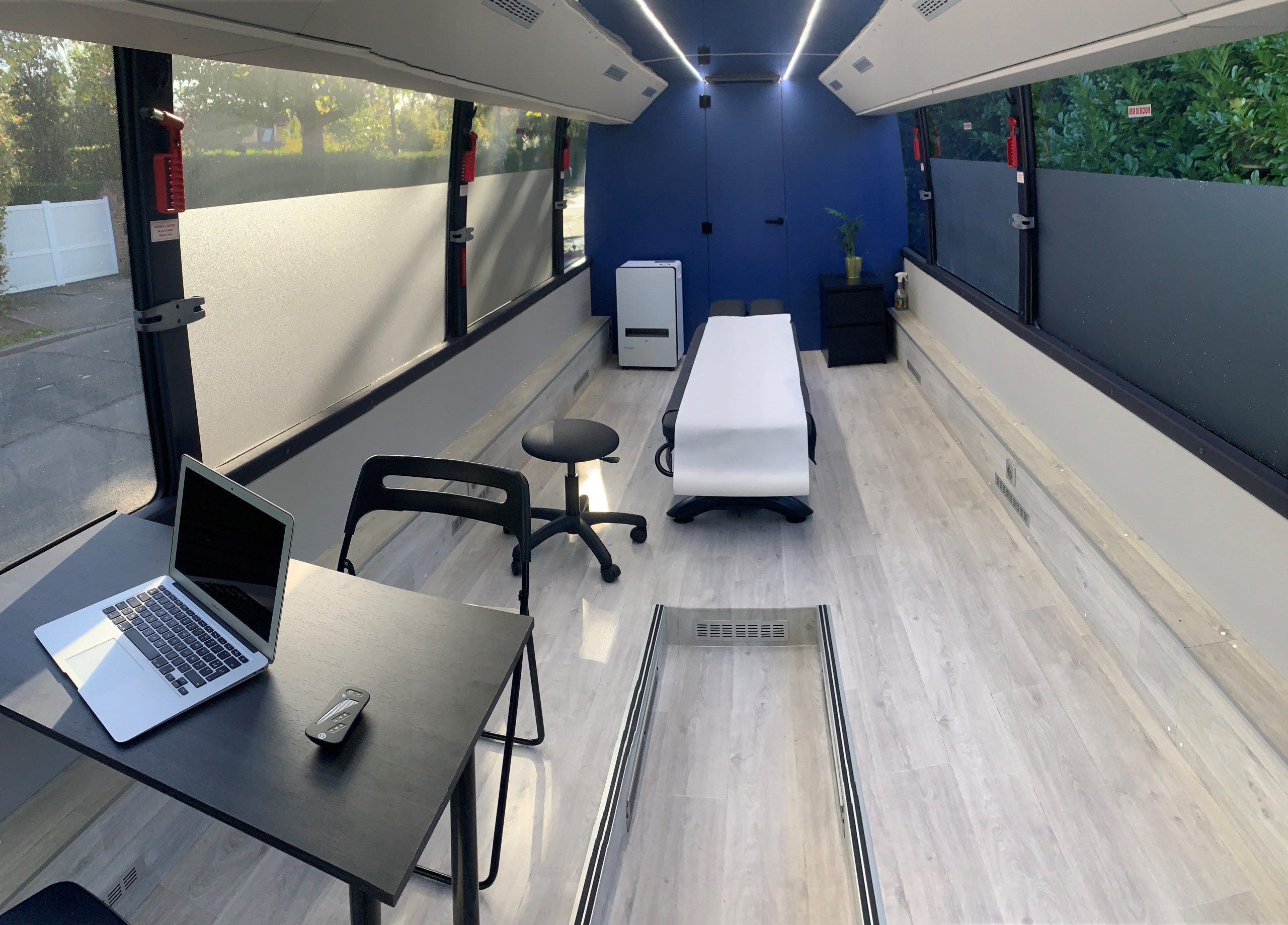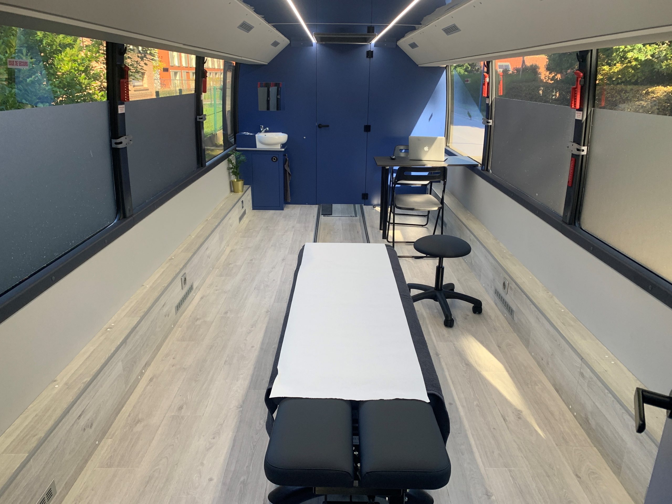 Un Autocar de 10 mètres transformé en un cabinet d’ostéopathie avec tout le confort possible pour les patients et l’ostéopathe.